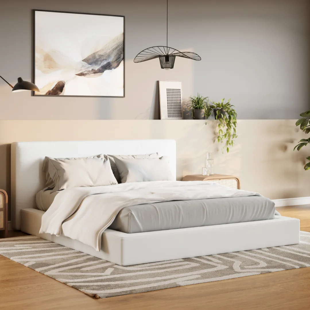 Complete your sleep sanctuary with our Ultra Upholstered Bed Frame and Round Bolster Pillow. Ultra Headboard shown in snow white fabric.